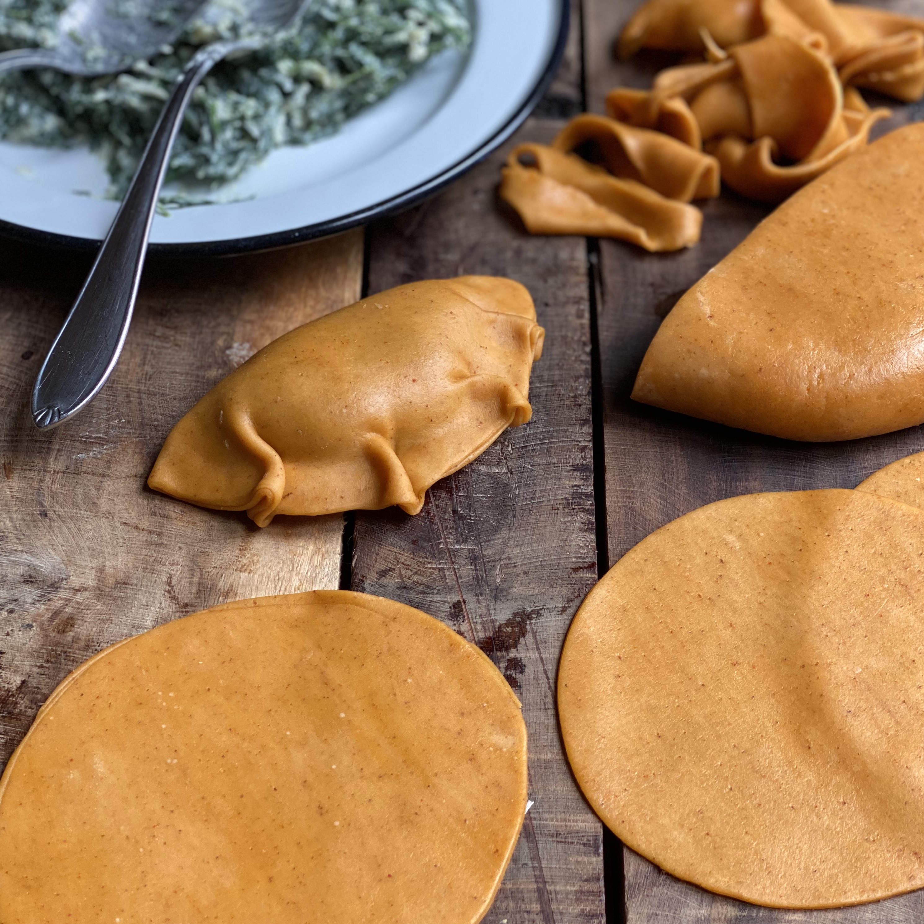Para el relleno: Espinaca congelada 300 gr, cebolla salteada 1 u, queso fresco 200 gr, queso parmesano 100 gr, queso crema (no ácido) 2 cda, sal c/n y pimienta c/n.