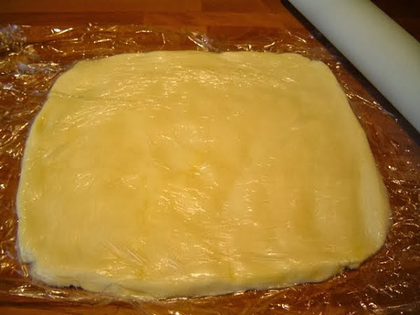 Entre dos trozos de plástico de cocina, iremos con un rodillo de cocina, aplastando la mantequilla y le dando la forma de un rectángulo, de unos 20 x 28 centímetros de ancho, la queremos fina.