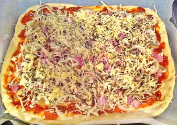 -Cubrimos la masa con tomate y los ingredientes que más nos gusten, en mi caso fue beicon, cebolla, champiñones, queso y orégano.