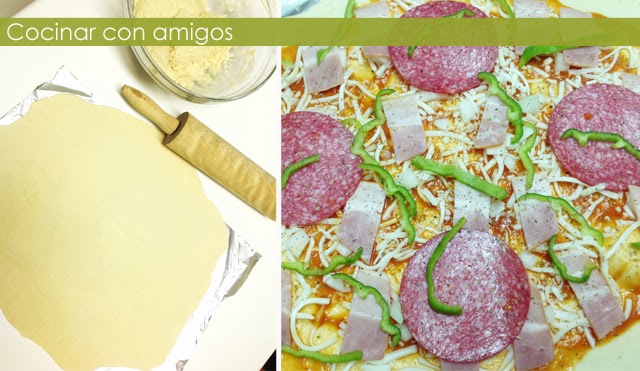 Cubrimos con los ingredientes, esta iría preparada por este orden: tomate frito, orégano, mozzarella, cebolla picada, bacon, salami, pimiento verde, orégano y chili molido (Foto 2-2).