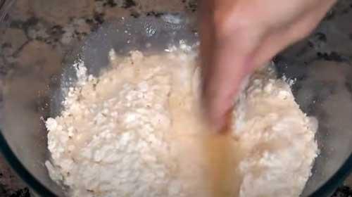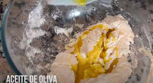 5. A continuación, añadimos el aceite de oliva virgen extra y lo integramos a la masa. Puedes ayudarte de las manos si te es más fácil de amasar.