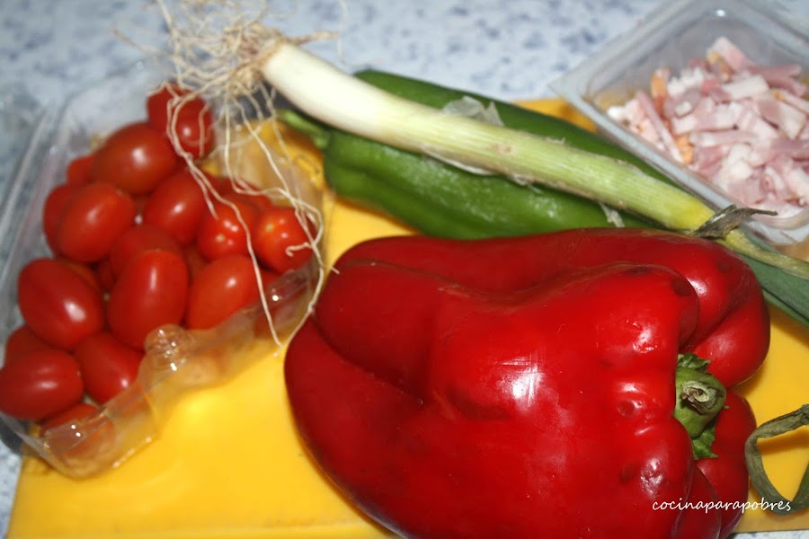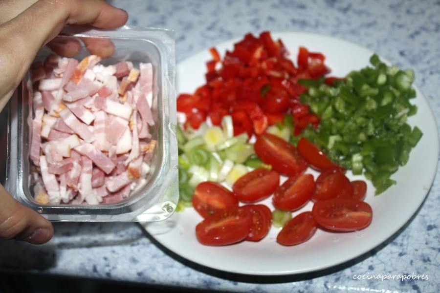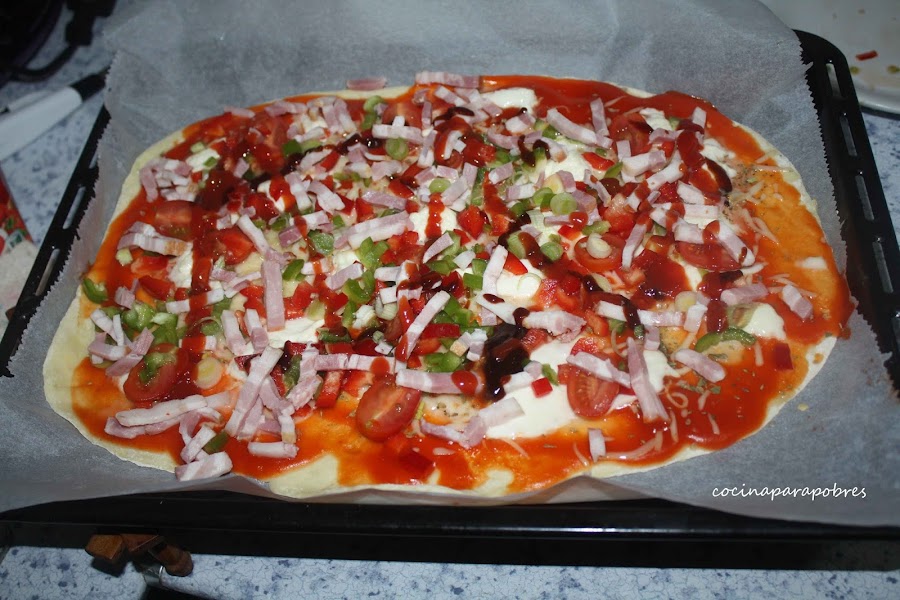 Cubrimos la superficie de la pizza con tomate frito, si quiere ver como lo preparo casero pincha aqui o si lo prefieres puedes usar tomate frito en bote. Ponemos oréganos, mozzarella y queso rallado, sobre esto las verduras troceadas. Rematamos con un chorrito de kectchup por encima de la pizza.