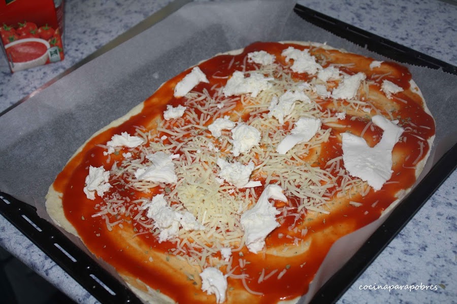 Colocamos la base de nuestra pizza sobre la bandeja del horno previamente forrada con pepel de hornear .