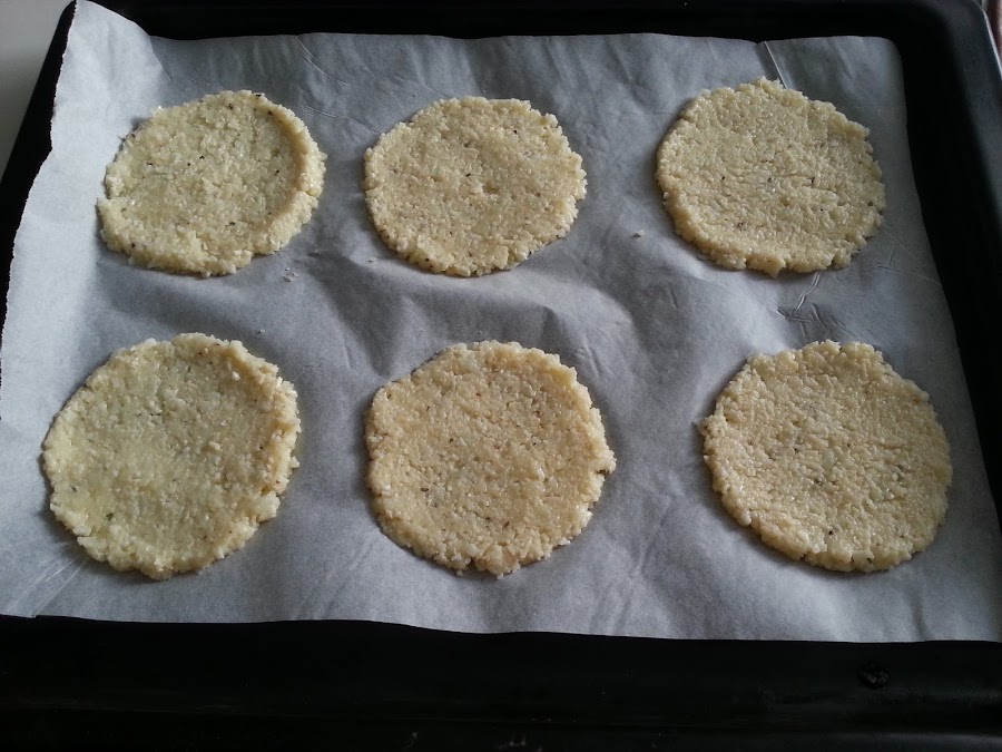 6. - En la bandeja del horno ponemos papel para hornear y vamos haciendo las bases, con una cucharada de la mezcla anterior y extendiéndolas con la cuchara, dándoles forma de pizza.