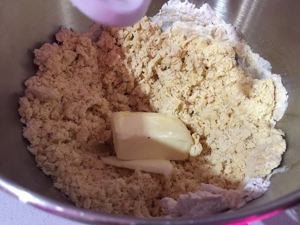 3. Añadimos la mantequilla a temperatura ambiente y continuamos amasando hasta que se forme la masa. Hacemos un par de reposos de 3-4 minutos y continuamos amasando. No os deseperéis al principio toma una textura arenosa, conforme vamos amasando aparece la masa, una masa elástica nada pegajosa.