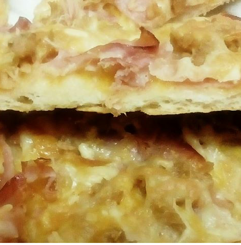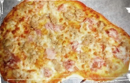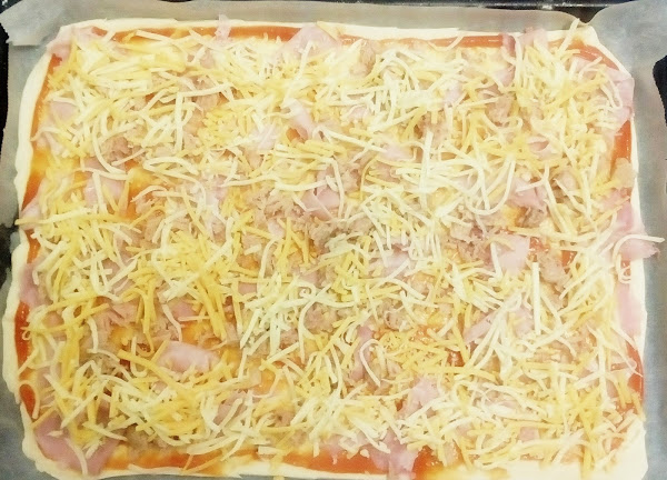 Precalentamos el horno 250 grados, colocamos la masa encima de un papel de horno en la bandeja de hornear, colocamos los ingredientes a nuestro gusto, nosotros tomate frito (no demasiado), jamón york, atún y una mezcla de cuatro quesos.