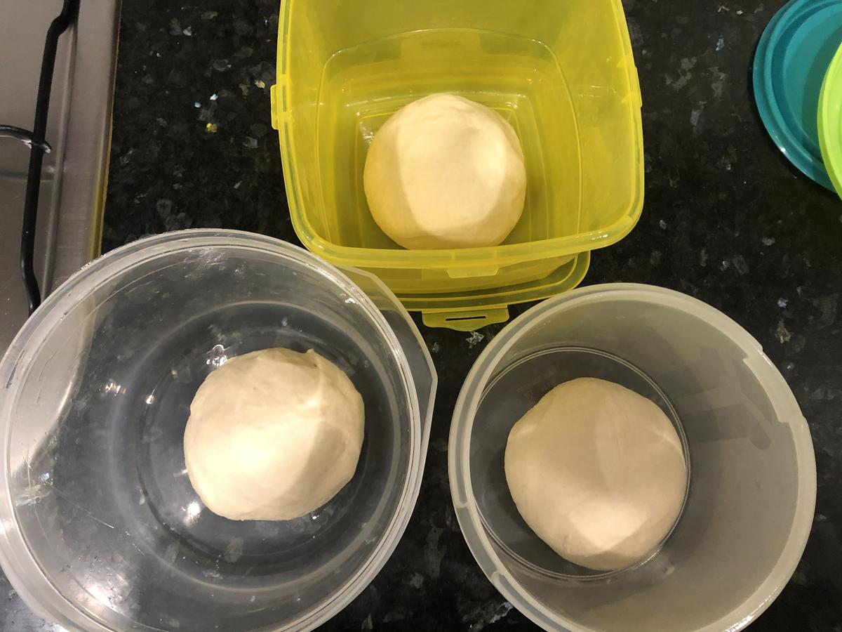 6. Dividimos en 3 porciones de unos 300gr cada una. Damos forma de bola y guardamos individualmente en recipientes herméticos que previamente habremos untado ligeramente con aceite de oliva.