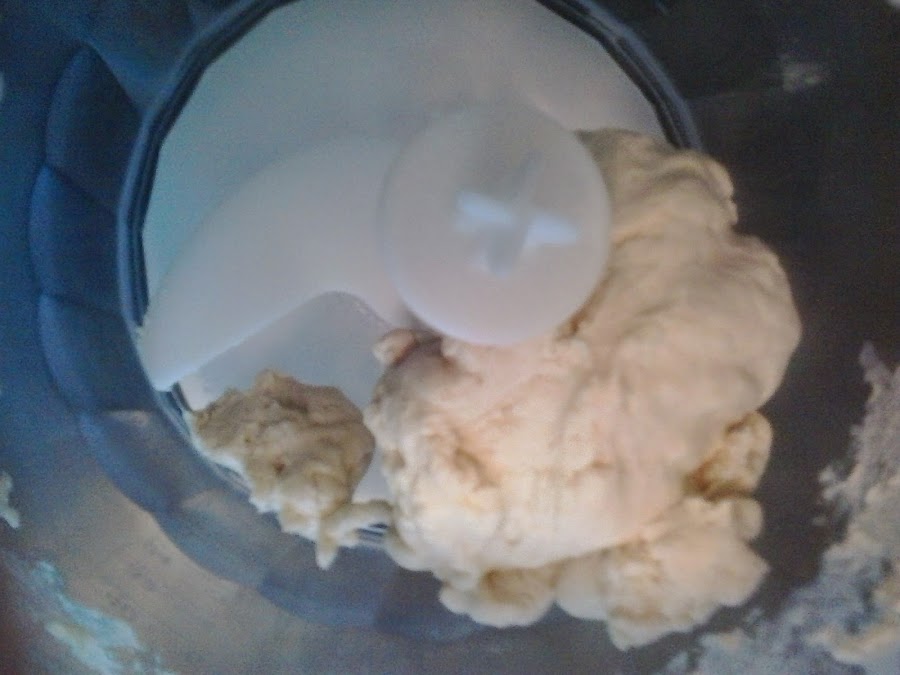 Para hacer la masa necesitaremos, una pizca de sal, un vaso de agua templada y un vaso de harina de fuerza o de pizza. Si tenéis procesador de alimentos, os llevará sólo unos segundos hacerla y os quedará algo así, una masa homogénea y elástica.