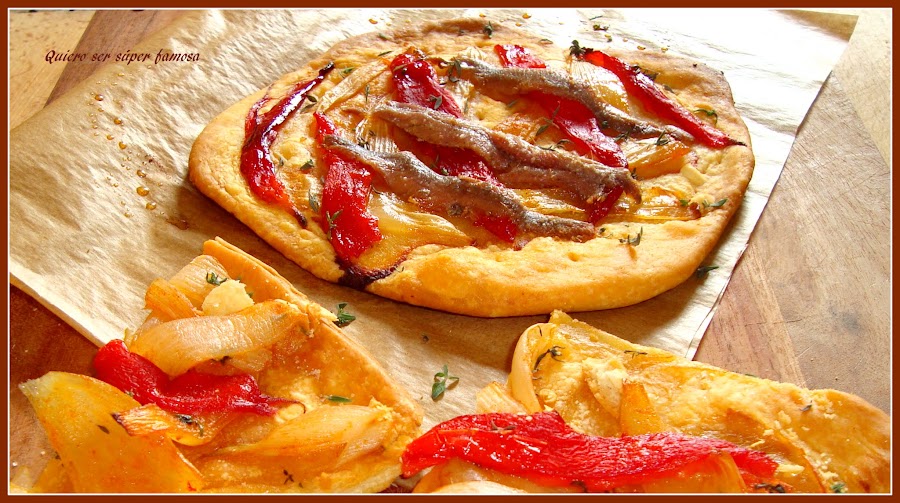 A principios de mes quise hacer una coca salada y no estaba segura qué tipo de masa elegir. Hubiera sido fácil hacerla con la de pizza pero al final decidí probar distintas opciones. Empecé por una que venía publicada en los sobres de levadura. La podéis ver aquí. Costó un poco que estuviera suave y lista para levar pero el resultado fue muy bueno. La segunda prueba no llevaba levadura y añadía cerveza a los ingredientes básicos. El resultado fue una masa muy crujiente. La tercera opción, la de hoy, incluye en sus ingredientes manteca de cerdo. He horneado una porción de masa fina y otra algo más gruesa. Esta última queda mejor. Si se estira demasiado la textura se vuelve crujiente y arenosa como una galleta.