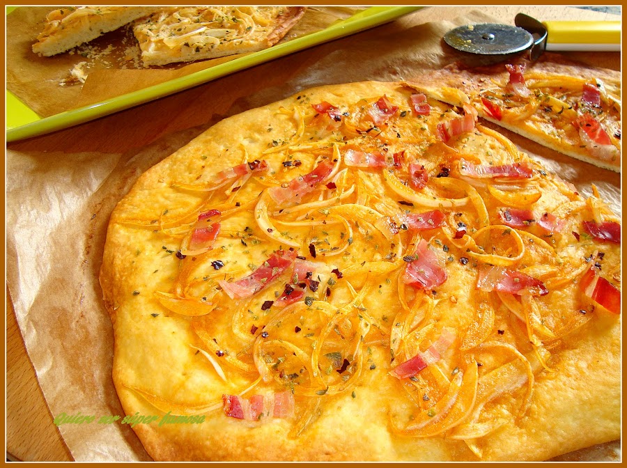 Distribuir por encima de las dos cocas la cebolla bien empapada de aceite de oliva y pimentón. En una de ellas añadir beicon cortado a tiras finas. Condimentar con peperone picante y orégano. En la segunda solo orégano.
