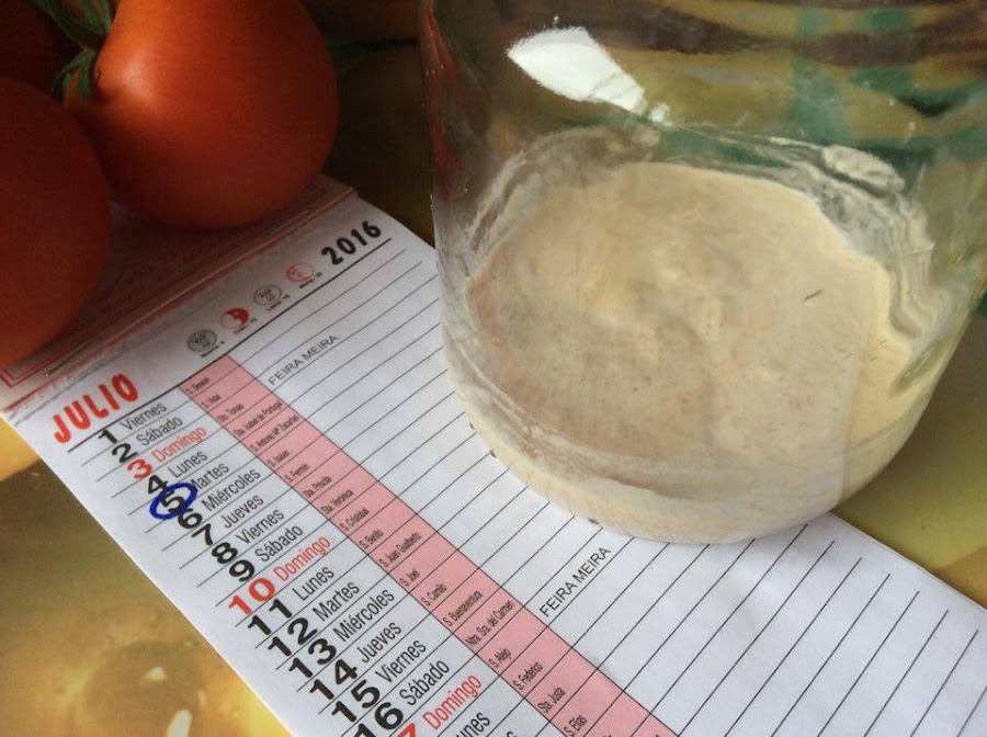Día 4: Tenemos la mezcla burbujeante y con un olor ácido, pero agradable. Con gran dolor, hay que tirar 3/4 de la mezcla, yo me he quedado con 150 g, he lavado el tarro y la he vuelto a meter. La parte que he tirado ha sido la parte de arriba con el líquido marrón. A continuación he añadido 100 g de agua a temperatura ambiente, 125 g de harina de fuerza. He revuelto bien y de nuevo a esperar otra 24 horas. La temperatura sigue siendo de unos 20º.