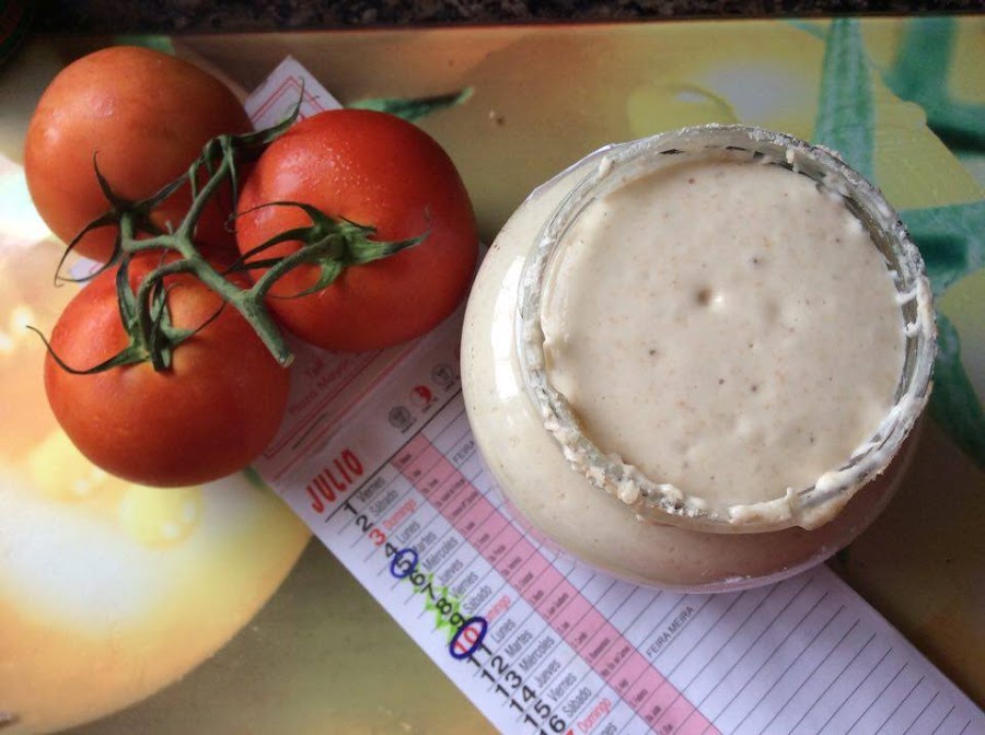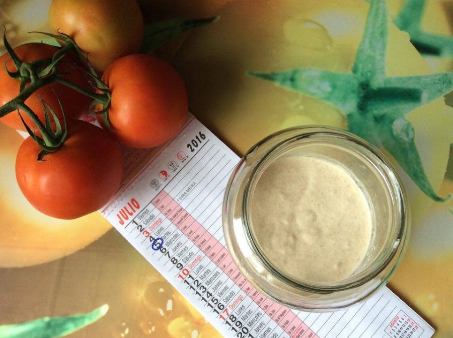 Día 2: Mi querida futura masa madre tiene hoy un color brillante con alguna burbujina. Se ha formado un poco de líquido en la parte superior. Vuelvo a añadir los ingredientes listados: primero el agua, dos cucharaditas de harina integral y tres de fuerza. Revuelvo hasta que quede todo bien mezclado. De nuevo le pongo el papel de cocina para taparlo y lo dejo reposar a temperatura ambiente (de nuevo 20º y nublado, muy veraniego todo).