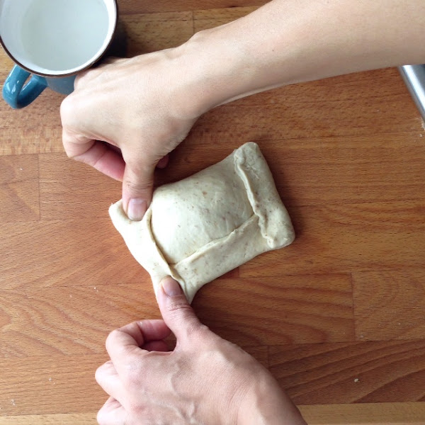 Pincelar los bordes con agua, doblar como señala el paso a paso y depositar en una bandeja aceitada.