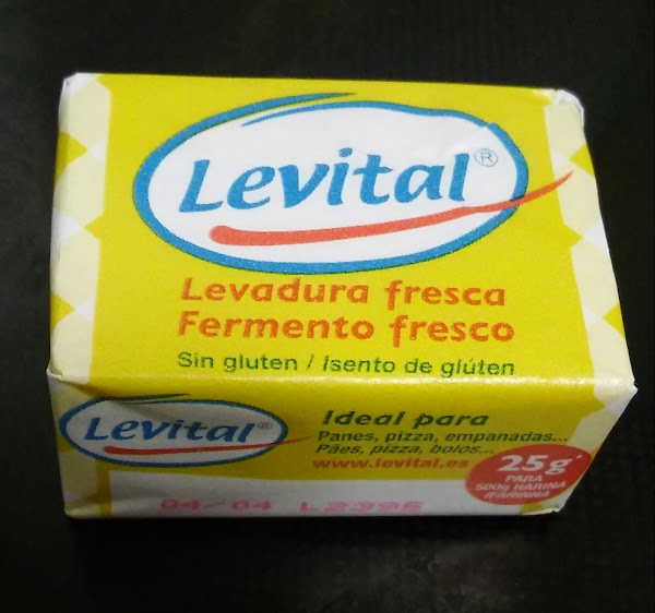 Yo he comprado levadura fresca, que se puede comprar en cualquier supermercado o hipermercado, en la sección de refrigerados. Os dejo foto a continuación de la que yo he comprado. De esta pastilla utilizaremos 2/3 del total.