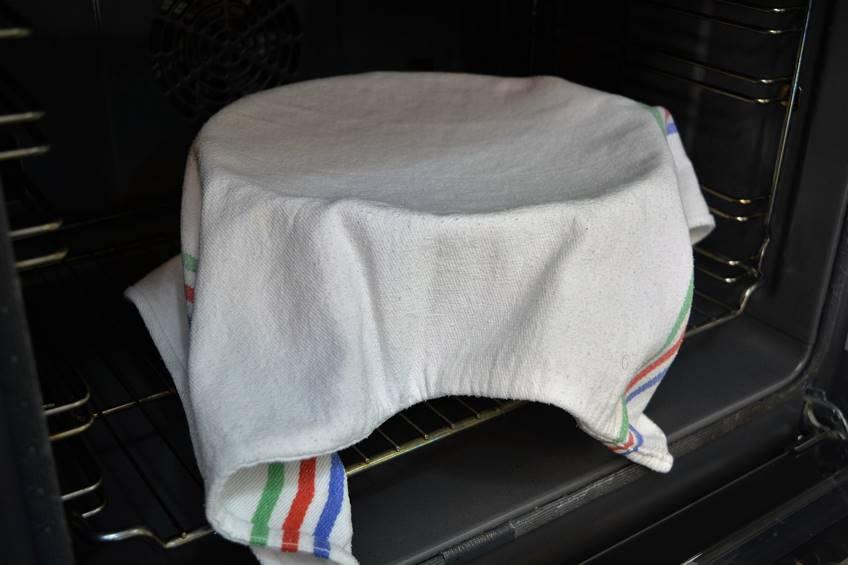 Paso 4 Si veis que no sube lo suficiente, os recomiendo darle calor. Para ello es perfecto el horno, pero no a mucha temperatura, no queremos asarla solo darle calor para que suba. Para que os hagáis una idea, yo la metí después de hacer un bizcocho con la puerta abierta durante 10-15 minutos, ese es el nivel de calor aproximado.