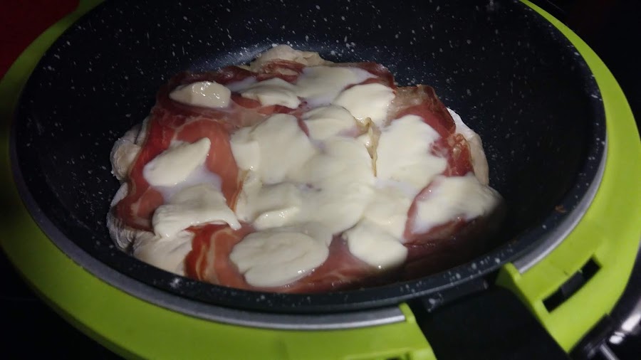 Y la mía fue con lonchas de jamón serrano, no es el mismo que se usa en Italia pero a falta de pan....queso mozzarella, tampoco es la auténtica y cuando ya la saqué le puse rúcula por encima, ésta si es igual que allí, algo tenía que tener auténtico de ingredientes .