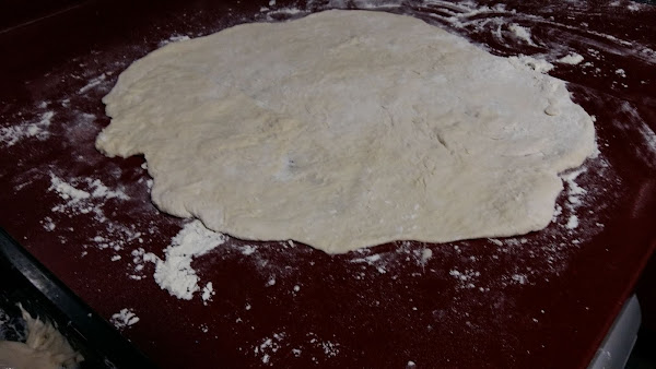 Una vez terminada ésta operación levantamos la pizza, ya formada, para introducirla en la cubeta, que previamente habremos pincelado ligeramente con aceite y le sacudimos la harina sobrante. El recoger la pizza es algo engorroso, si la masa está floja se hará de nuevo una bola, pero con la ayuda de un recoge-bizcochos o pizzas no tendréis ningún problema.