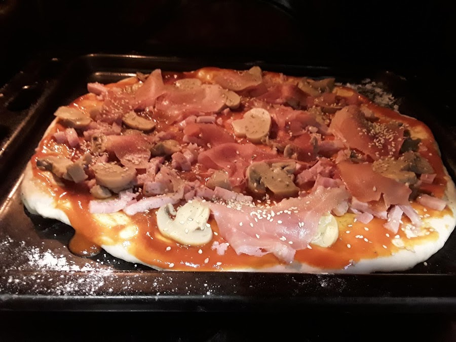 Ahora ya echamos un poquito de harina en el banco y vamos trabajando cada bola de masa para hacer la forma de la pizza (redonda, o cuadrada según os guste), podéis hacerlo con las manos o con el rodillo, yo lo he hecho con ambas, con el rodillo he estirado y he dado forma y luego la he cogido y con las manos he ido dejando que cuelgue para que se estire, así rodando por toda la masa circular (porque no me atrevo a girarla en el aire, aún no he cogido práctica), la dejáis lo fina que os guste, si queréis que salga crujiente pues unos 3-4 mm, (dejamos reposar en una bandeja de horno durante 10 minutos espolvoreada con un poquito de harina natural), si os gusta más gruesa o esponjosa ( dejamos reposar en una bandeja de horno durante 35-40 minutos para que vuelva a fermentar) pasado este tiempo procedemos ya a poner los ingredientes, (ponéis con una cuchara el tomate frito, o salsa barbacoa, champiñones en láminas, bacon a trocitos, trocitos de jamón serrano en lonchas, etc... como os guste, y por último espolvoreáis con orégano), y ya pasamos a hornear durante 10 minutos a fuego fuerte (250º) para que se dore, y quede crujiente, pasado este tiempo podemos bajarlo durante 5 minutos a 210 º para que se acabe de hacer, para la más gruesa y esponjosa hornearemos 20 minutos aproximadamente a 220º y nada ya sólo os queda servir y degustar, buen provecho