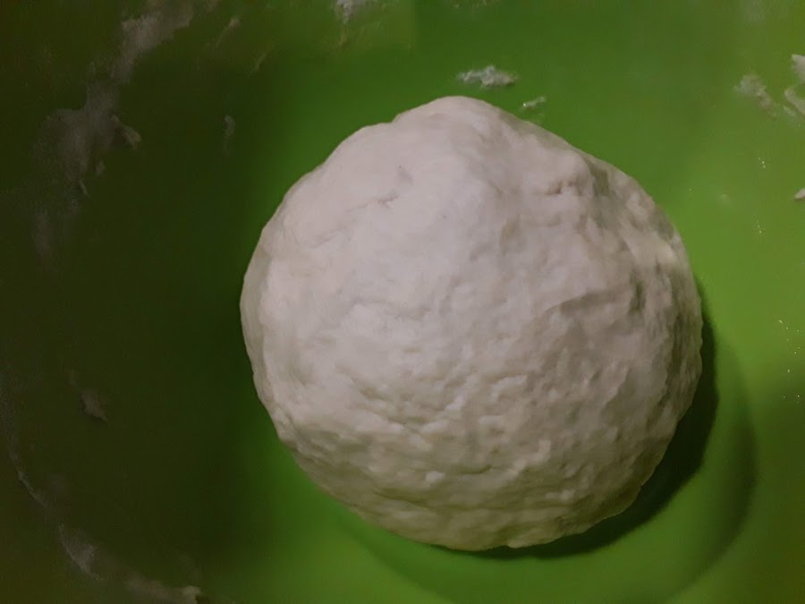 ahora cogeremos harina común y echaremos un poquito en el banco de la cocina y procederemos a amasar con las manos durante durante unos 10 minutos (para que quede elástica la masa hay que refinarla, para refinarla aplastamos la masa con la palma de la mano o con un rodillo, ahora la retorcemos, es decir hacemos como un churro alargado, ahora cogemos los dos extremos, los unimos y amasamos con las manos para fusionar la masa, repetimos este proceso durante los 10 minutos aproximadamente), cuando esté la masa ya lista, nos untamos las manos con aceite y formados una bola que pondremos en un bol o táper y tapamos para que fermente y suba el volumen durante unas 3 horas aproximadamente.