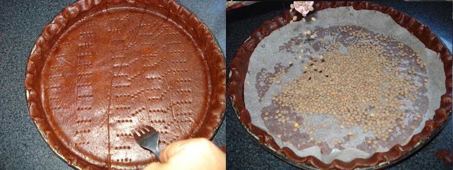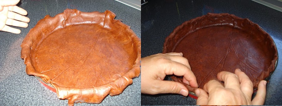 La estiramos con el rodillo, mejor entre dos hojas papel vegetal, hasta el tamaño deseado y la ponemos sobre el molde, formamos los bordes y pinchamos la masa con un tenedor para que no suba.
