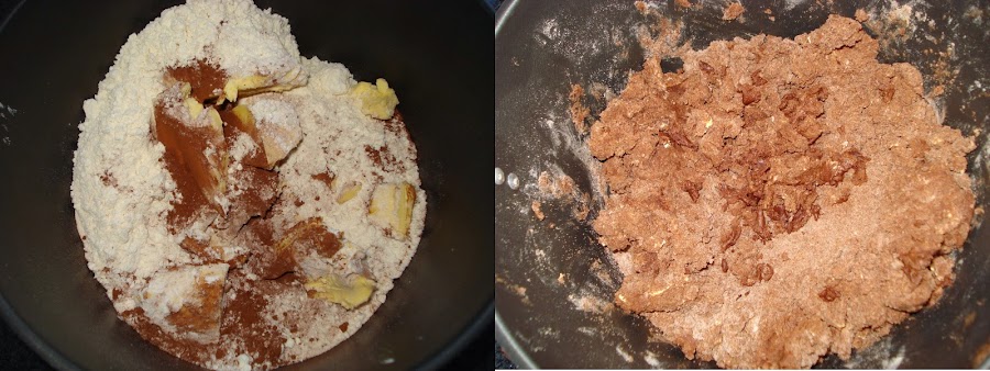 Sacamos la mantequilla y el bol del congelador, le añadimos la sal, el azúcar, la harina y el chocolate y vamos mezclando los ingredientes con los dedos hasta que se forme una especie de pan rallado.