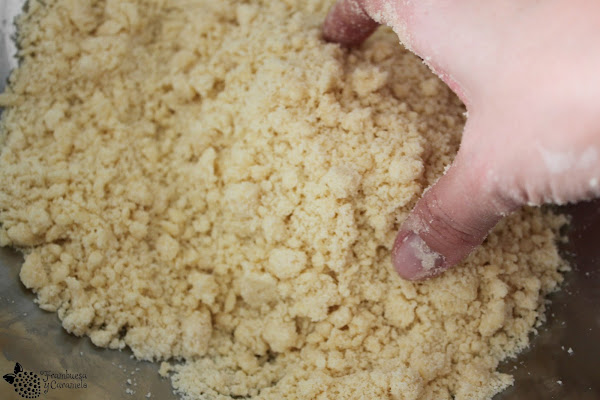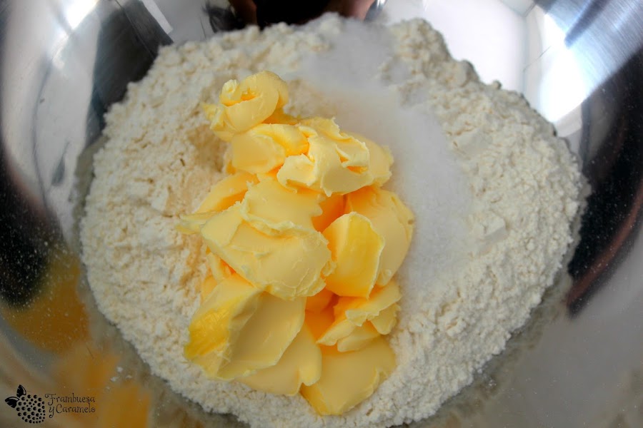 1. Mezclamos en un bol la harina, la mantequilla y el azúcar, hasta obtener una mezcla arenosa. Hay que evitar trabajar en exceso esta mezcla, lo justo para que la mantequilla quede perfectamente integrada con la harina y el azúcar