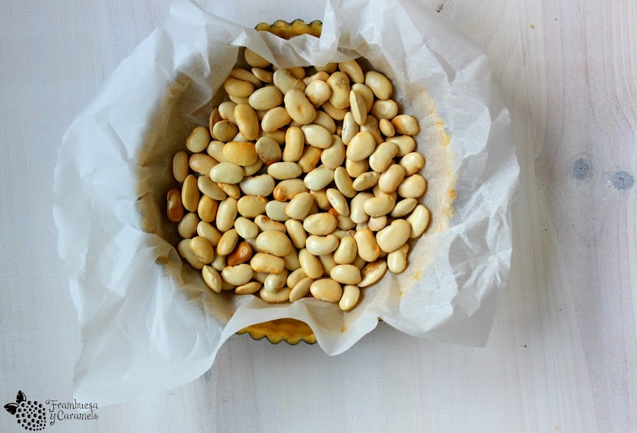 7. Ponemos papel de horno sobre la masa y peso encima (cualquier legumbre nos sirve), horneamos en la zona baja del horno:
