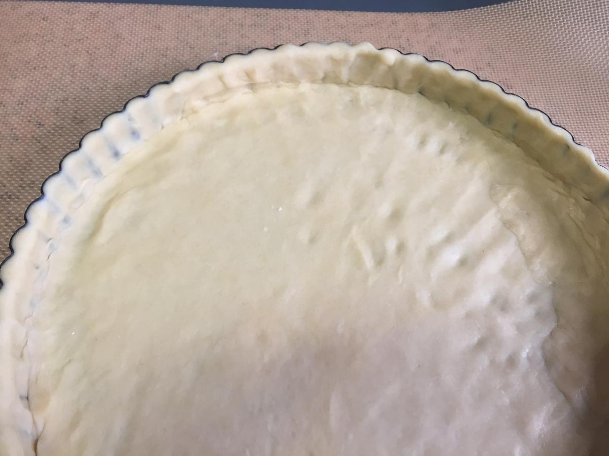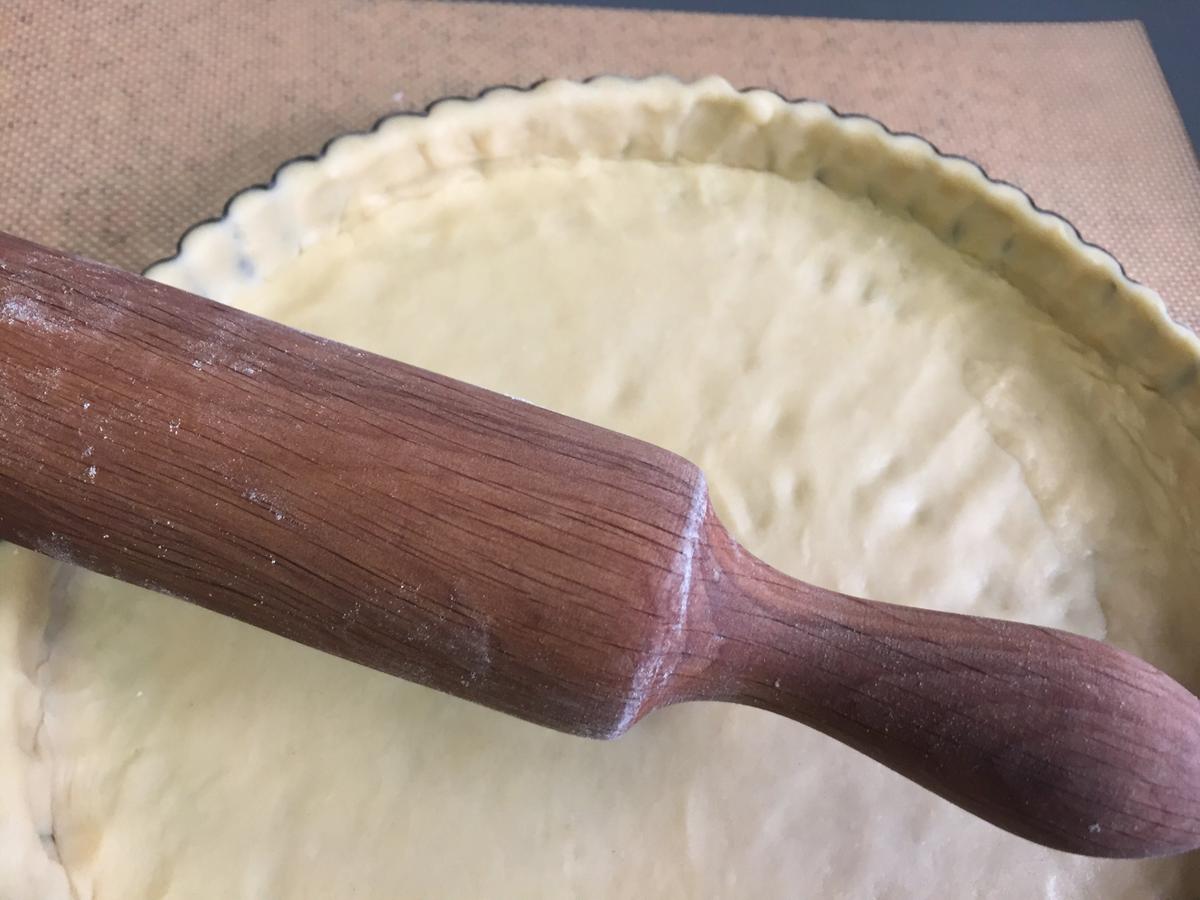 3. Pasado este tiempo, sacamos la masa de la nevera, la estiramos sobre nuestra superficie de trabajo una y forramos con ella el molde donde la vayamos a hornear (para trasladarla al molde, podemos ayudarnos enrollándola masa en el rodillo). Yo utilizo un molde de aro desmontable.