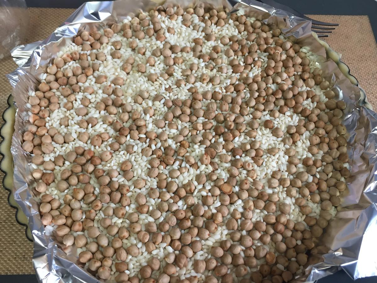 6. Con un tenedor, pinchamos toda la superficie de la base. Ponemos papel de plata sobre la masa, y cubrimos con legumbre secas. Debemos poner este peso para que la masa no suba al hornearla.