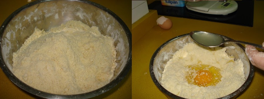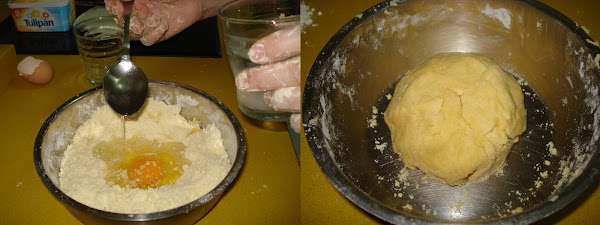Hacemos un hueco en el centro de esta mezcla y añadimos el huevo y los líquidos, seguimos trabajando con los dedos hasta que esté todo bien integrado, entonces tapamos con un paño limpio y dejamos reposar en el frigorífico como media hora antes de usarla.