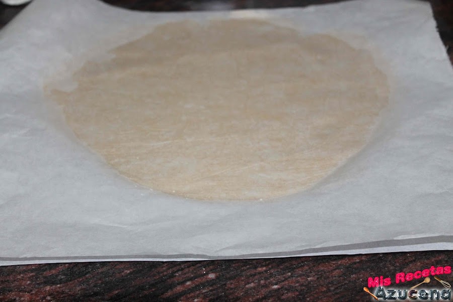 Transcurridas las dos horas sacaremos de la nevera espolvoreamos un poco de harina sobre nuestra encimera, con ayuda de un rodillo trabajaremos la masa para extenderla al tamaño del molde que tengamos pensado utilizar, también podéis poner la masa entre medio de dos papales vegetales para darle la forma.