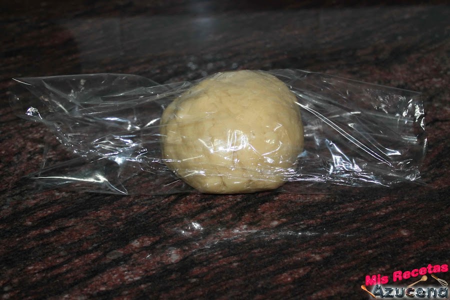 Cogemos film transparente y pondremos la bola de masa y la guardamos en la nevera un mínimo de 2 horas para luego poder trabajarla bien.