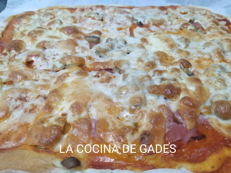 La masa ya estirada la pondremos en la bandeja del horno y la rellenaremos a nuestro gusto, en este caso le añadimos, salsa tomate, champiñones, jamón cocido y mozarela. Metemos al horno precalentado 200° hasta el queso se funda.
