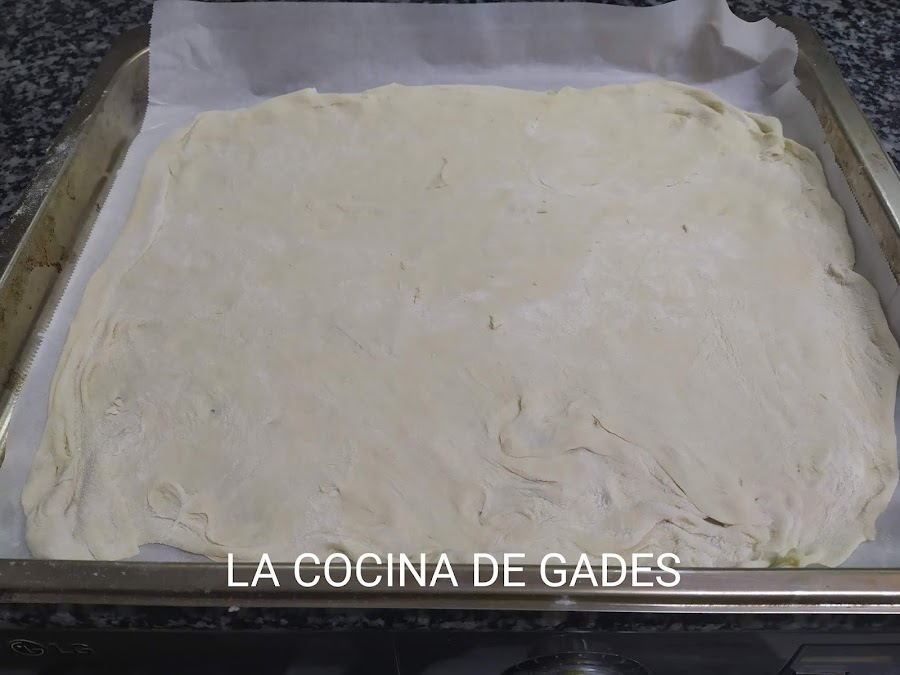 Estiramos la masa con el rodillo y le damos la forma deseada, yo le di la forma rectangular de la bandeja del horno.