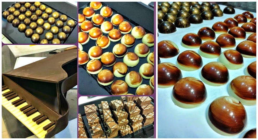 Nos enseño técnicas de relleno de media y larga duración, el encamisado de los bombones, decoraciones en chocolate…