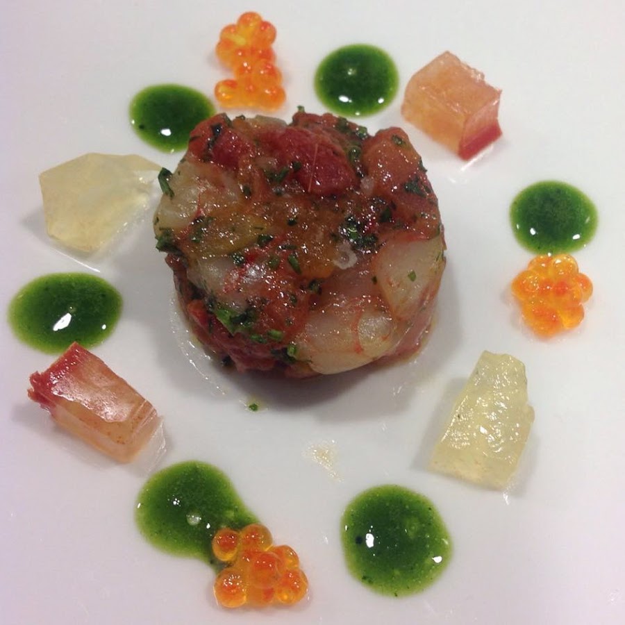 Empezamos con un tartar de gamba de Palamós, tomates confitados, dos gelatinas de tomate y plancton marino. Parece muy complicado pero una vez Pere Arpa nos enseño como confitar los tomates en el horno y como conseguir con un solo tomate dos gelatinas completamente diferentes de color y sabor nos pareció cosa de niños. ¡¡Muy grande Pere Arpa!!
