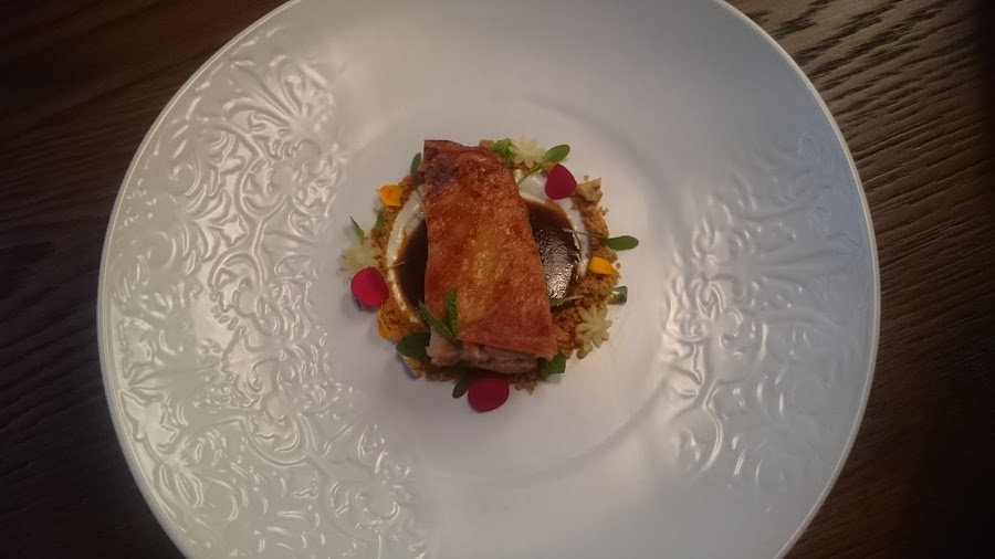 ...para luego sentarnos en la larga mesa y catar el Salmonete en caldo corto de azafrán, escamas y nueces. Tan delicado.