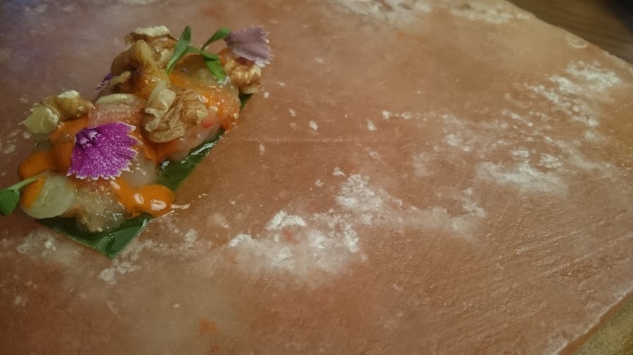 - Ceviche de carabineros y nueces en roca de sal sobre hoja de plátano