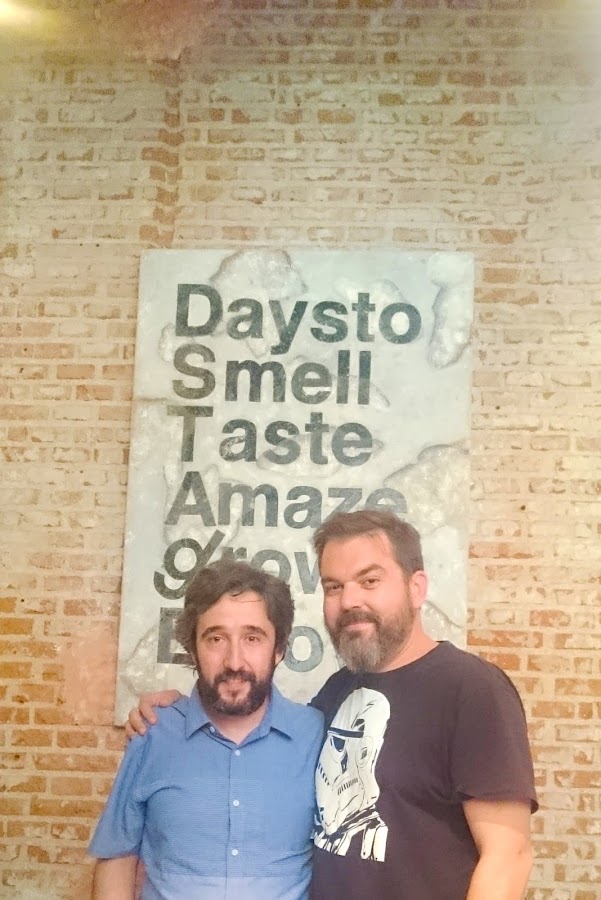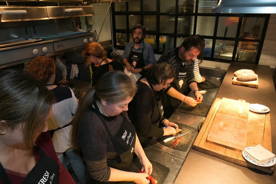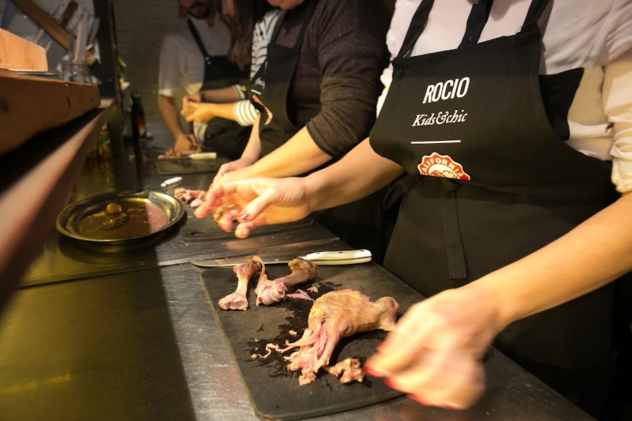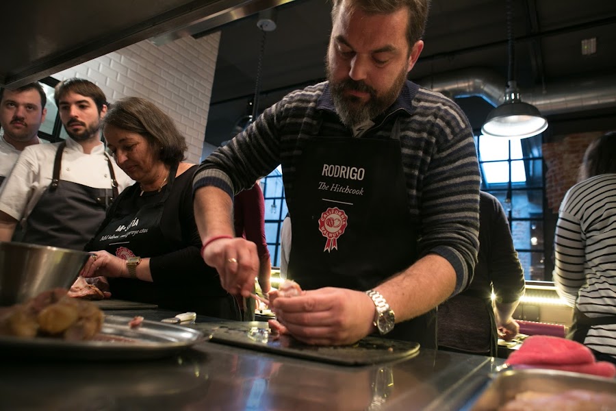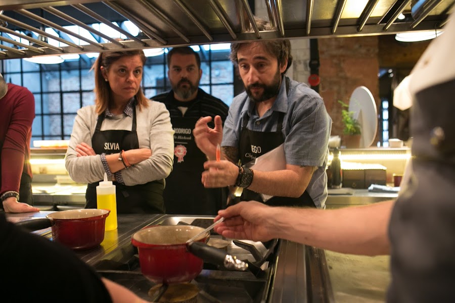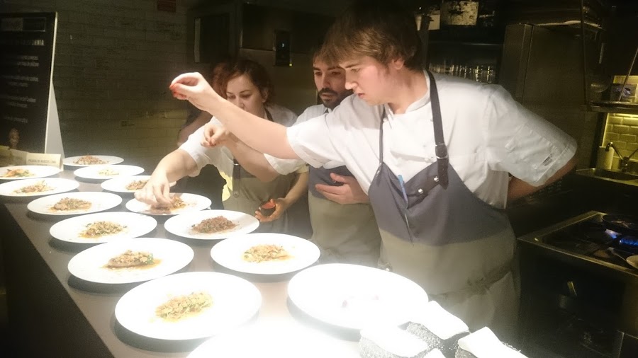 Y tras cruzar esa puerta que separaba la realidad de la calle con la magia de la cocina, empezamos a notar que la fantasía cobraba vida. Allí nos esperaban Javier y Lorena (responsables de NDC) para recibirnos cálidamente, repartir una buena dosis de buen espíritu (se les notaba igualmente emocionados con el proyecto), hacernos entrega del uniforme de trabajo a modo de mandil personalizado y asegurarnos la confortabilidad en el lugar. Éramos los intérpretes secundarios, protagonistas de alguna forma - en alguna escena previa - pero decisivos en el desarrollo argumental.