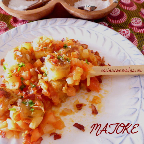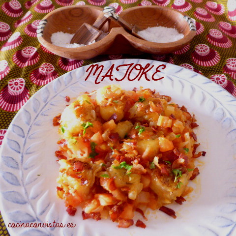 Esta receta se la debo a Ely Otino que durante mi estancia como voluntaria en la Misión de Aliwuan (Uganda) tan amablemente nos preparaba la comida con lo que allí había (que no era mucho). Yo he añadido bacon, cosa que no se encuentra ni de casualidad en Aliwuan, allí lo que cocinan son termitas que, por cierto. están buenísimas.