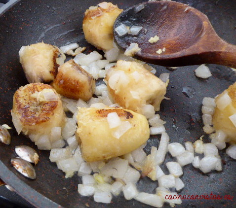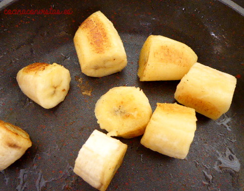En el aceite donde hemos dorado el bacon vamos a dorar ahora, a fuego medio bajo, los trozos de banana por todos los lados, cuando estén a nuestro gusto añadimos la cebolla y dejamos que se vaya poniendo transparente, unos 7 minutos.