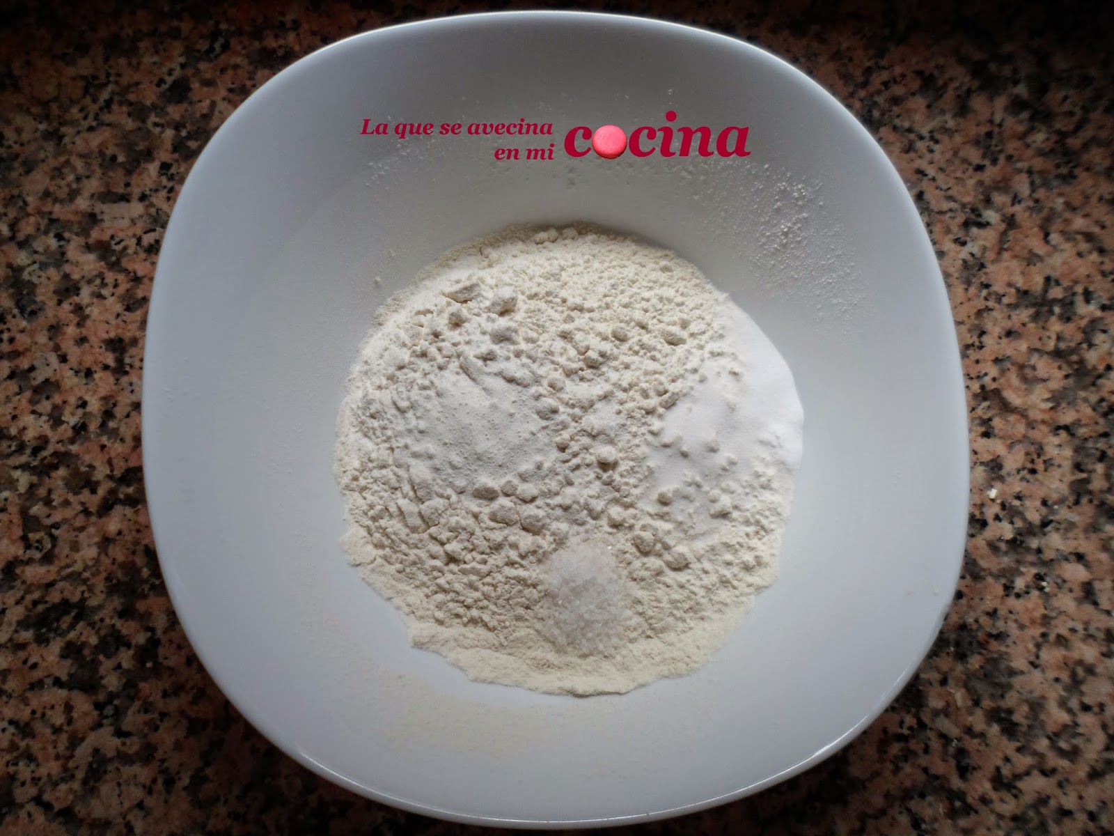 Una vez que los tengamos cortaditos, los reservamos. A continuación en un bol, tamizaremos la harina, la levadura, la sal y el bicarbonato.