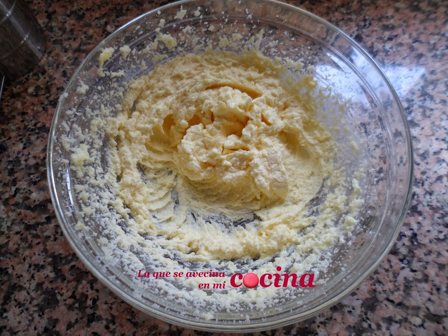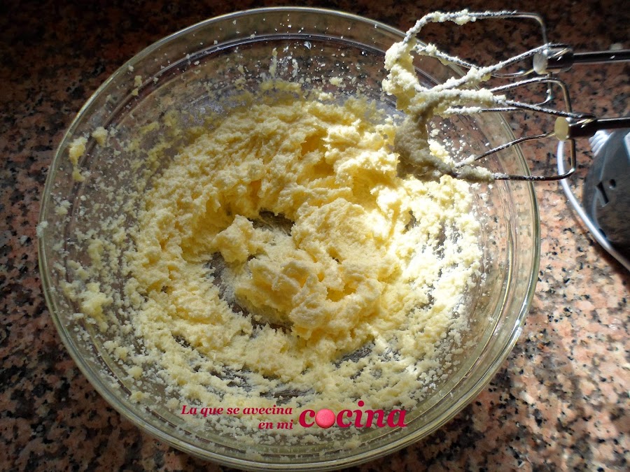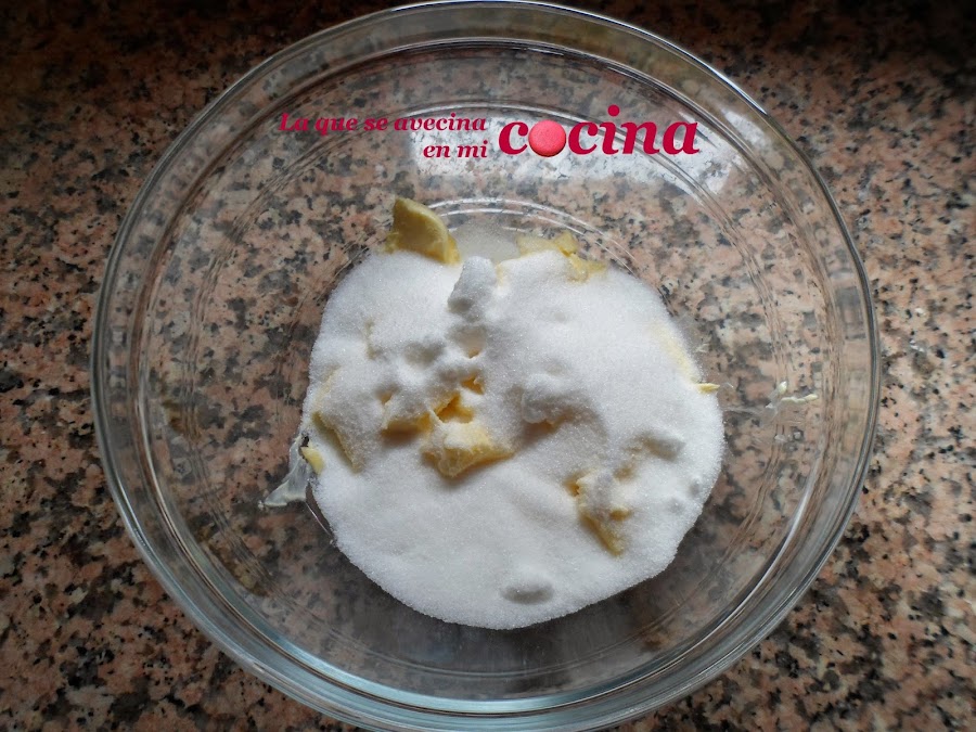 En otro bol y con unas varillas eléctricas, batiremos el azúcar y la mantequilla a punto de pomada durante unos 6 minutos a velocidad media-alta. Tenemos que ver que ambos ingredientes estén bien integrados y formen como una pasta esponjosa.