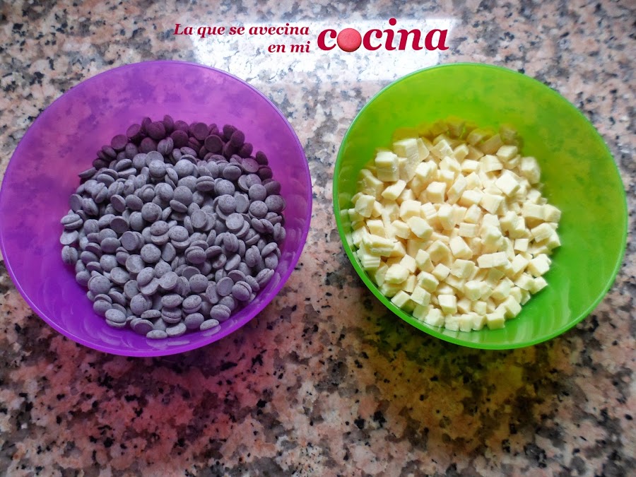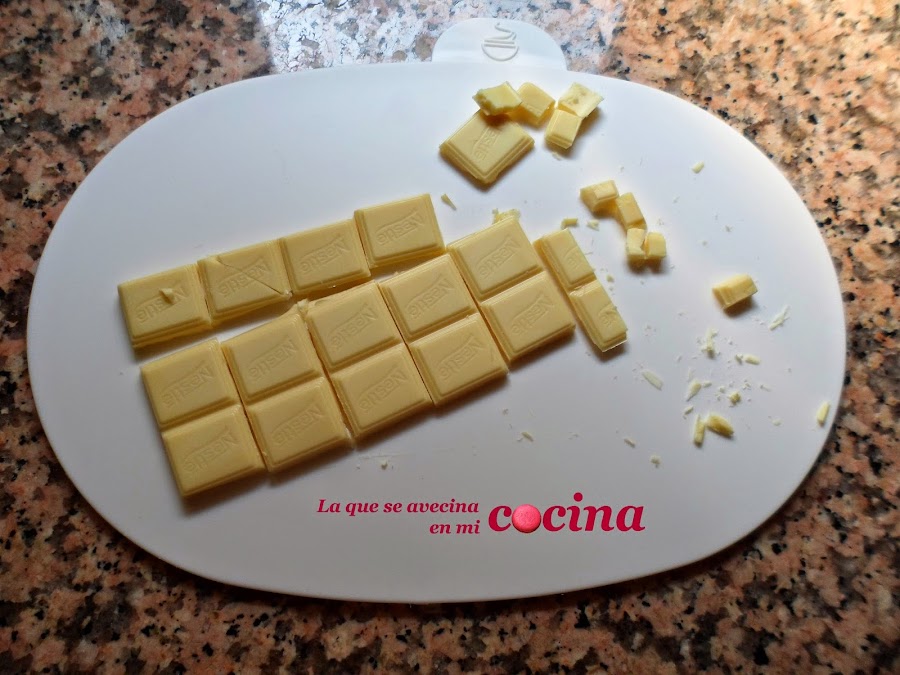 Como no teníamos chips de chocolate blanco, pero sí una tableta. Picamos en trocitos muy pequeñitos la tableta y así hicimos chips caseros de chocolate blanco.
