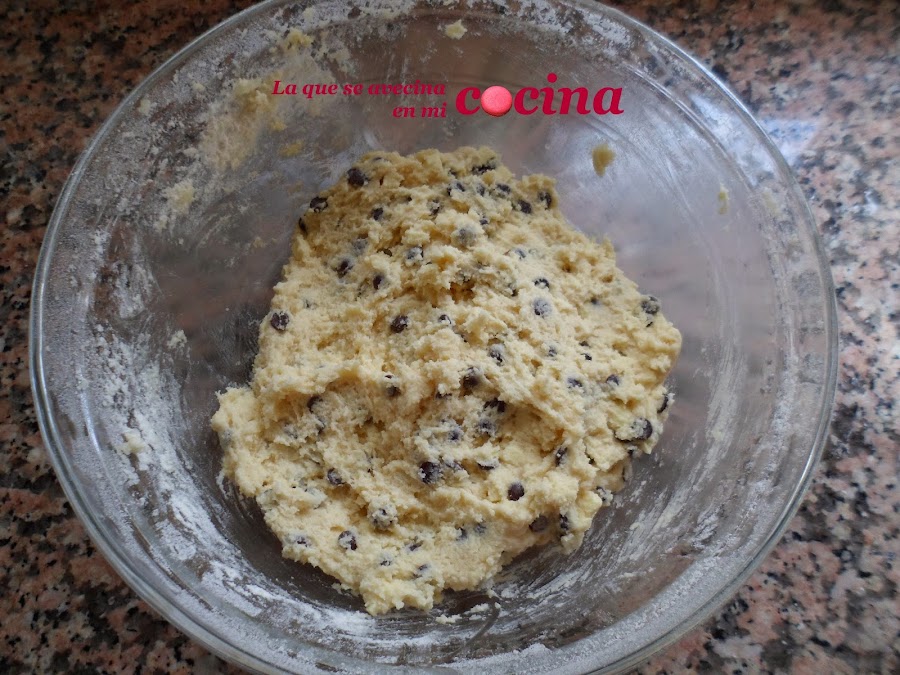 Ahora añadimos los chips que teníamos preparados y removemos un poco para que se esparzan por toda la mezcla.
