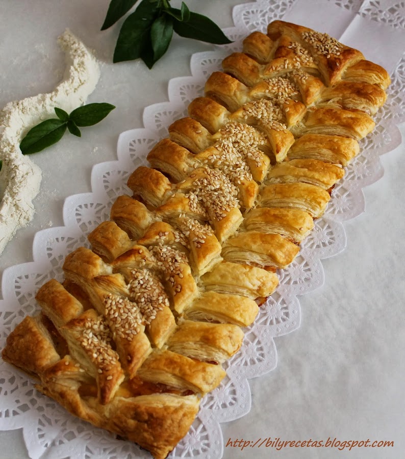 Esta vez he hecho el montaje como una especie de trenza. Podéis cortar el hojaldre en raciones individuales o dejarla así grande. Por supuesto podéis jugar con el relleno a gusto. Os dejo una foto del corte del hojaldre. En este caso no he dejado de cerrar la trenza hasta el final ya que he respetado la anchura de las lonchas del relleno. Abrimos el hojaldre, lo marcamos con el cuchillo en tres partes iguales sin llegar a cortar y cerramos las partes laterales dándole la forma deseada. Pincelamos con leche y horneamos a 180 grados hasta que este dorada la "napolitana".