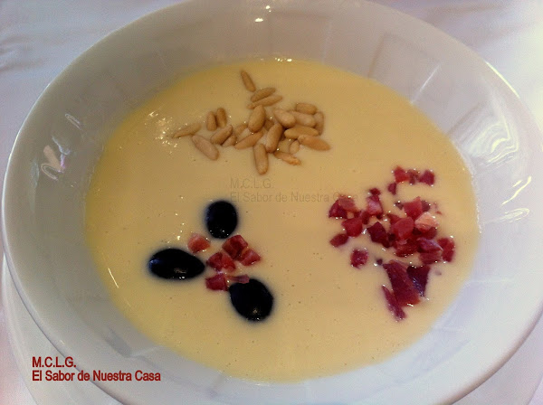 Guarnición: piñones, aceitunas negras y trocitos de jamón serrano