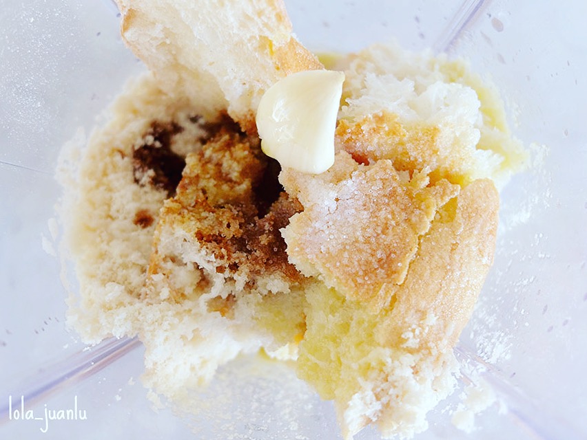 Troceamos el pan y lo echamos en el vaso del robot de cocina o batidora. Agregamos el agua y, si el pan está muy duro, lo dejamos reposar unos minutos para que se ablande y sea más fácil batir.