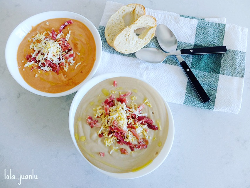 También se puede poner de guarnición la misma que ponemos en el salmorejo, virutas de jamón y huevo duro.