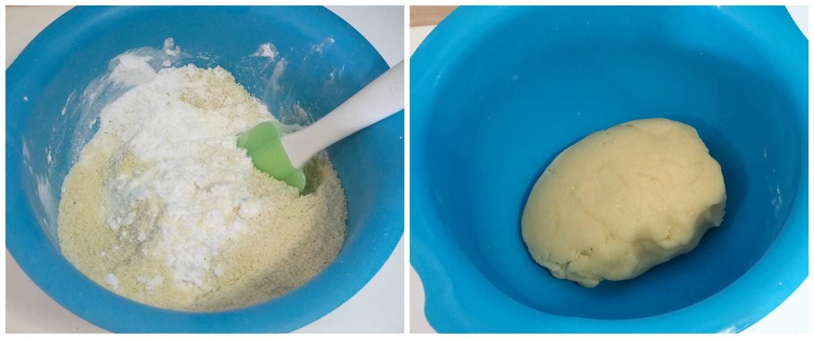 - En un bol mezclamos la almendra molida, el azúcar glass y la clara de huevo. Cuando esté todo más o menos integrado amasamos (mejor con las manos) hasta obtener una pasta fina y homogénea.